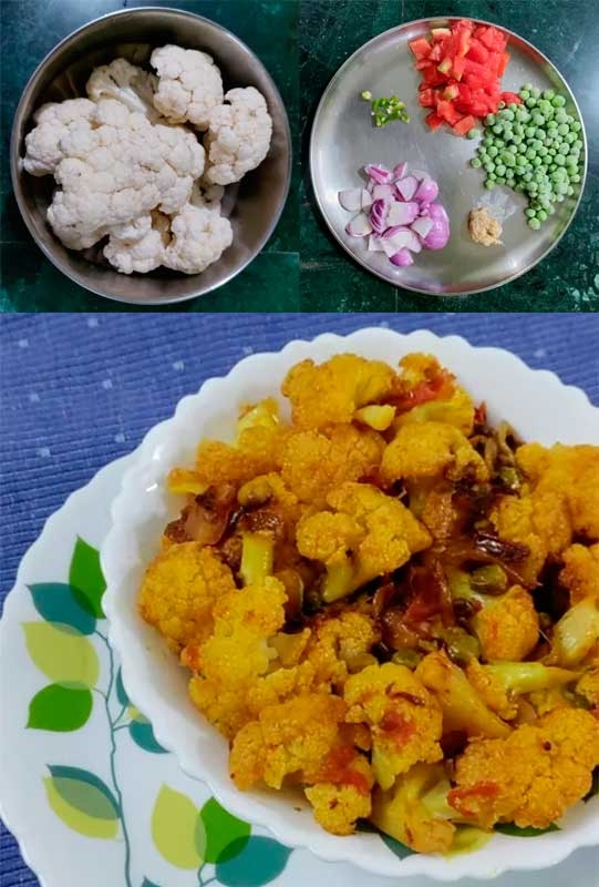 цветная капуста, репчатый лук, свежий зеленый чили, помидор, имбирно - чесночная паста, горчичное масло, зеленый горошек, куркума, кумин, фенхель, семена горчицы, калонджи, семена пажитника, соль