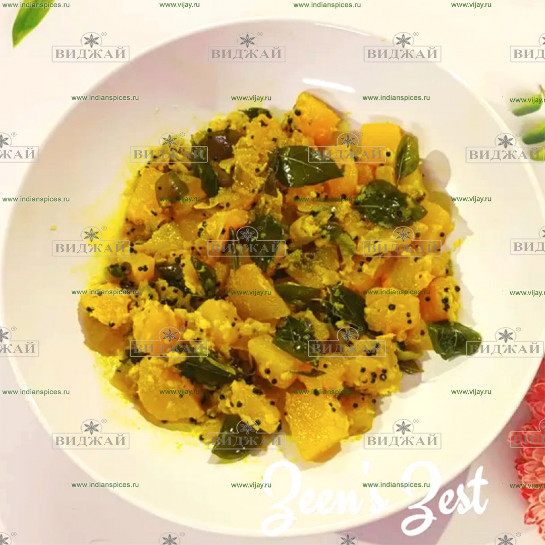 1 ч. л. солиКубики картофеля обжарьте в небольшом количестве масла гхи, добавьте немного воды, закройте крышкой и тушите до готовности. Обжарьте кусочки тыквы в масле гхи. Нагрейте гхи и добавьте семена горчицы, когда они начнут потрескивать, добавьте остальные специи, обжарьте в течение нескольких минут. Соедините вместе картофель, тыкву и обжаренные специи, осторожно перемешайте.