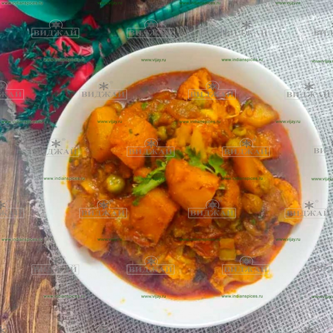 кинза, картофель, кумин, кориандр, свежий имбирь, перец чили зеленый, чеснок, овощной бульон, куркума, семена горчицы, соль, черный перец, помидоры