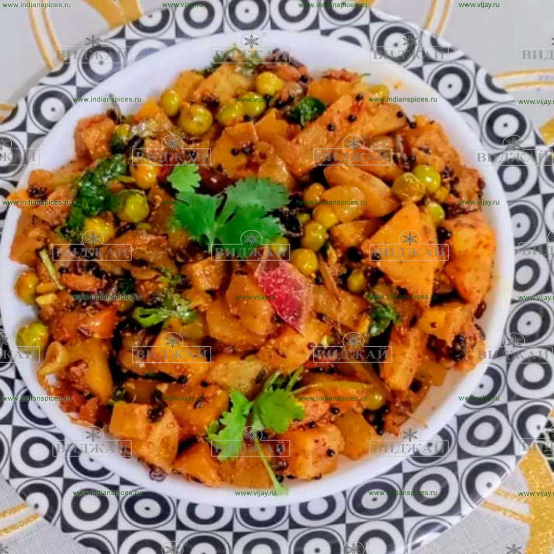 картофель, куркума, семена горчицы, кумин, хлопья чили, семена черного тмина, лавровый лист, фенхель, листья пажитника, асафетида, аджван, порошок манго, мята, арахисовое масло, томатная паста, чесночная паста, имбирная паста, тамаринд, соль, йогурт, кинза