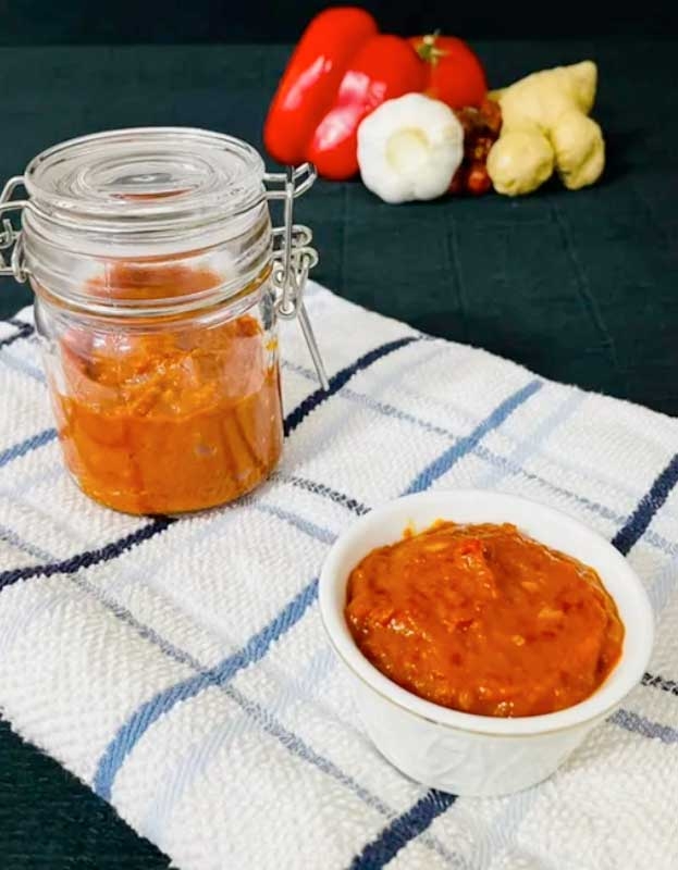 Удалите семена из красного перца чили и замочите его в воде на 30 минут. Слейте воду и переложите перец в чашу блендера вместе с нарезанным красным болгарским перцем, чесноком, имбирем, сахаром, солью и уксусом. Измельчите до получения однородной пасты. (Если используете острый сорт красного перца чили, то полностью удалите семена. При желании можно использовать кашмирский красный перец чили.)