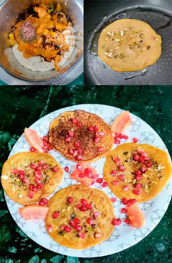 В Индии перед подачей эти блинчики украшают зернами граната и нарезанной спелой папайей.
