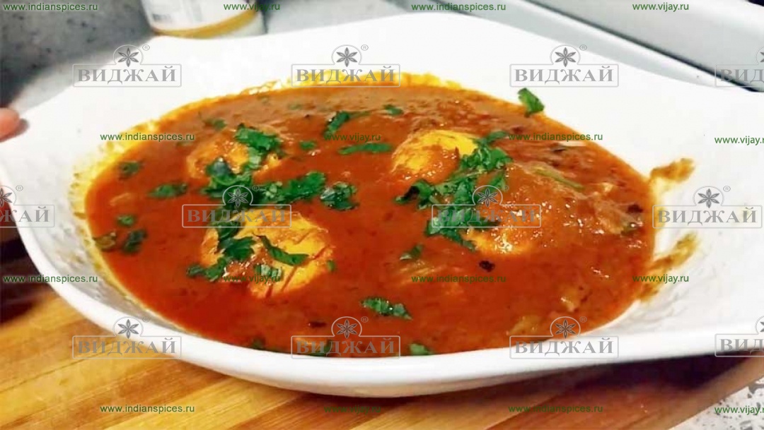 молотый кумин, молотый кориандр, кашмирский чили, вода, вареные яйца, растительное масло, репчатый лук, корица, мускатный цвет, бадьян, молотый мускатный орех, черный кардамон, зеленый кардамон, черный перец, гвоздика, куркума, молотый чили, йогурт, соль, имбирно - чесночная паста