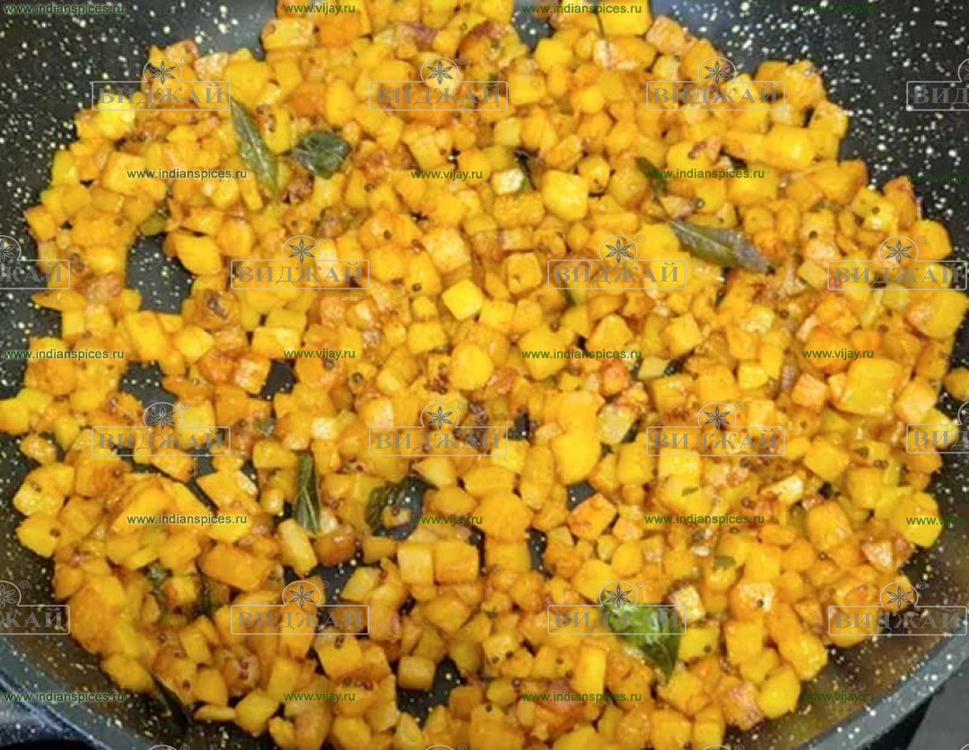 картофель, листья карри, асафетида, семена горчицы, оливковое масло, куркума, молотый чили, соль
