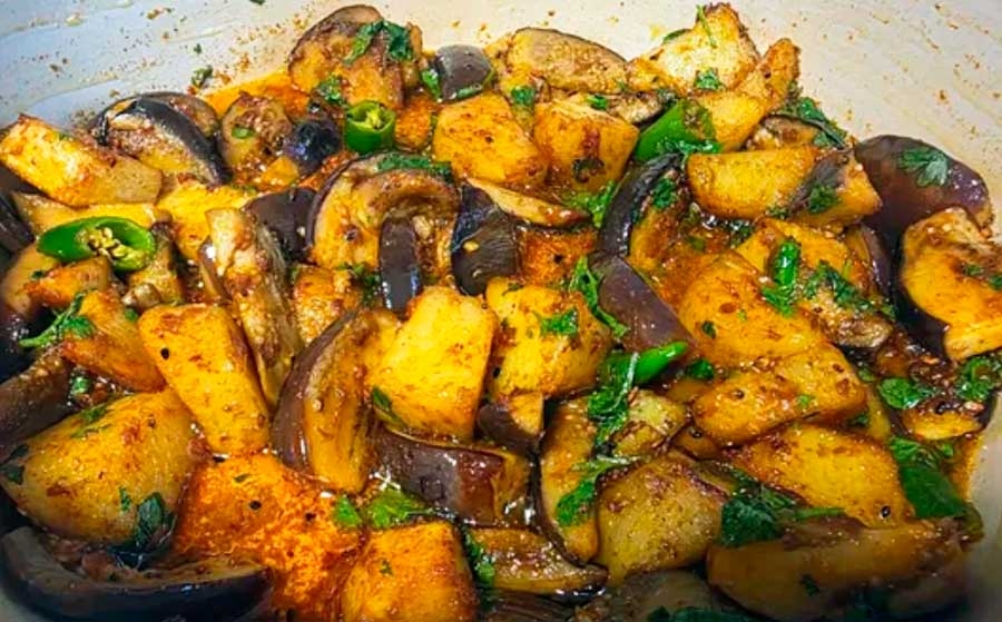 Это аппетитное блюдо, в котором землистый вкус баклажанов сочетается с сытным картофелем, приправленным пикантными специями для маринования.