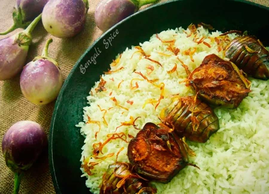 Жареные баклажаны по-бангладешски готовы. Подавайте с отварным рисом, кичри или роти и паратхой.