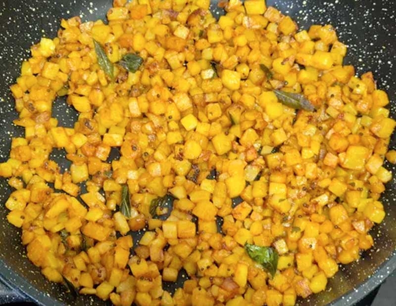 Как только семена горчицы начнут потрескивать, добавьте картофель. Перемешайте, чтобы картофель равномерно покрылся маслом.