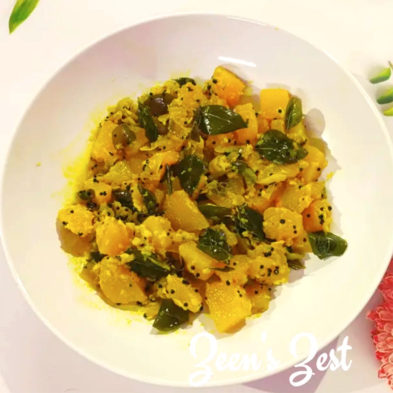тыква, лук-шалот, свежий зеленый чили, листья карри, семена горчицы, куркума, соль, кокосовая стружка, кокосовое масло