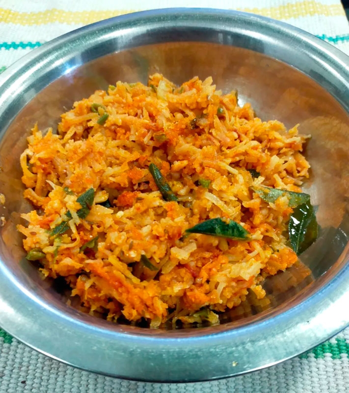 Натрите картофель на терке, тщательно промойте и слейте воду. Нагрейте арахисовое масло в сковороде. Добавьте семена кумина, зеленый перец чили и листья карри.
