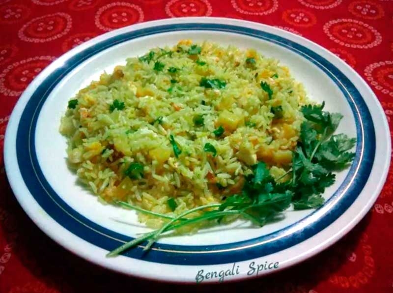 рис вареный, картофель, панир, репчатый лук, соевый соус, свежий зеленый чили, томатный соус, черная соль, соль, арахисовое масло, имбирно - чесночная паста, куркума, кинза, масло гхи
