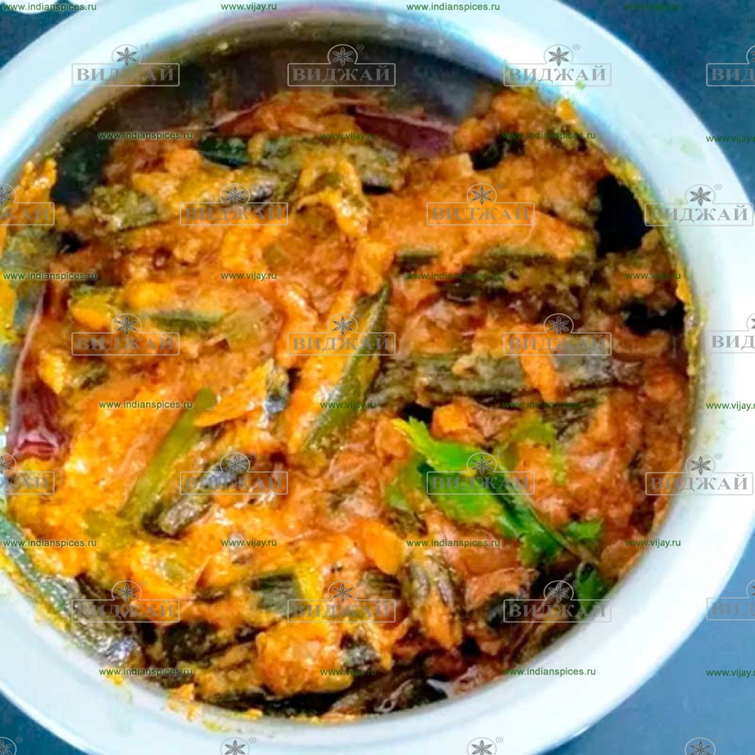 бамия, растительное масло, семена кумина, аджван, имбирно - чесночная паста, репчатый лук, томатное пюре, молотый чили, куркума, молотый кориандр, молотый кумин, гарам масала, молотый манго, листья пажитника, йогурт, сахар, соль, кинза