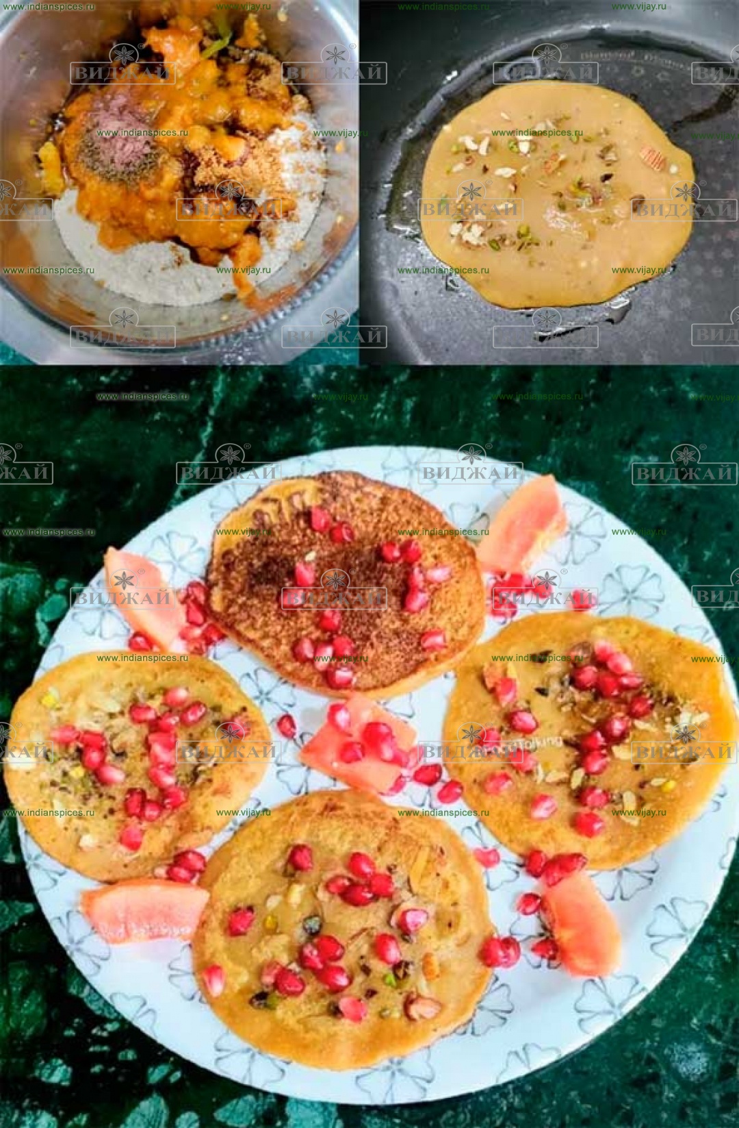 В Индии перед подачей эти блинчики украшают зернами граната и нарезанной спелой папайей.Поделиться: -