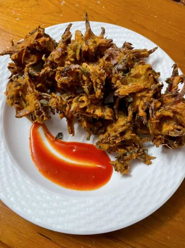 Это простое блюдо — очень популярный рецепт, который готовят в качестве вечерней закуски к горячему кофе/чаю. По сути, это обжаренные во фритюре луковые оладьи, приготовленные из нутовой муки, рисовой муки и специй.